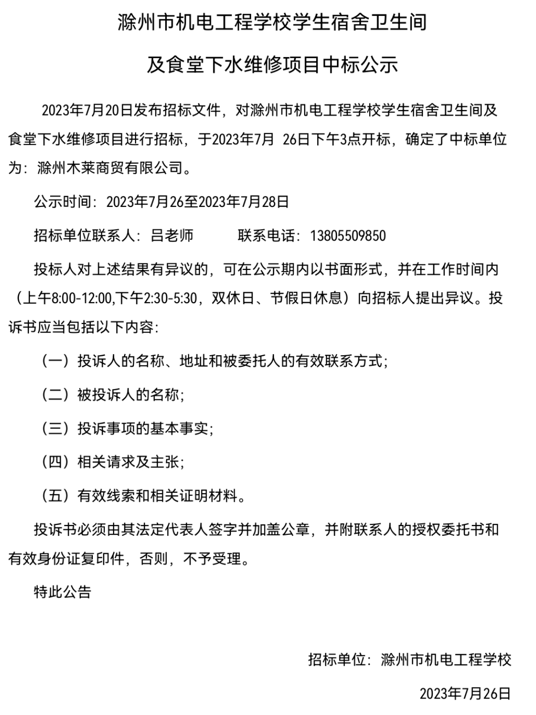 滁州市机电工程学校学生宿舍卫生间及食堂下水维修项目中标公示