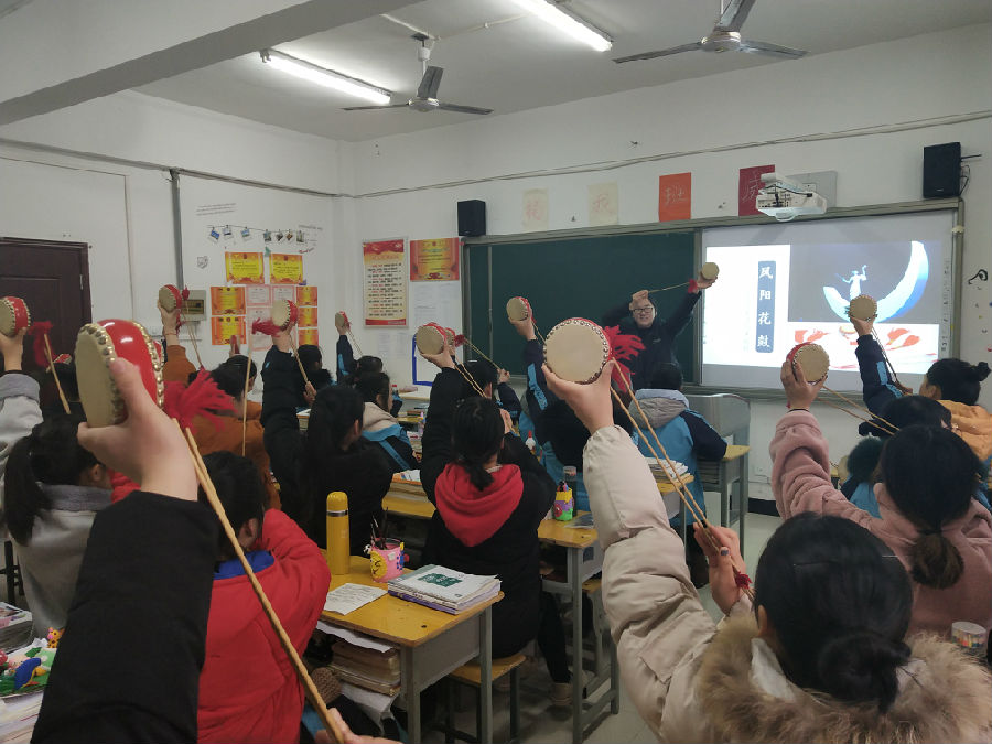“左手锣,右手鼓,手拿锣鼓来唱歌,别的歌儿我也不会唱,单会唱一支凤阳歌……”在朱老师的“非遗——凤阳花鼓”课堂上,同学们认真跟随朱老师学习。