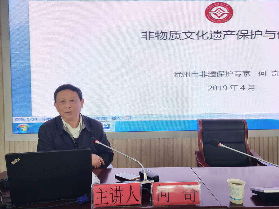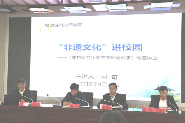 4月29日下午,学校在南校区土木水利楼3楼报告厅开展了“非遗文化进校园”活动。安徽省非物质文化遗产研究会理事,滁州市非物质文化遗产保护工作专家何奇受我校邀请,以“非物质文化遗产保护与传承”为专题,为我校师生带来了一场精彩的讲座。