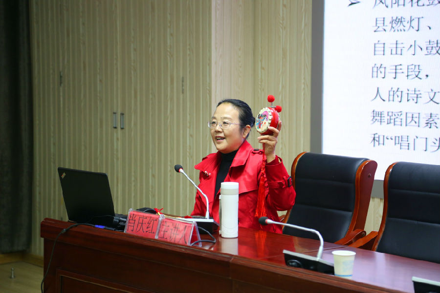 中国曲艺家协会、安徽省舞蹈家协会、滁州市曲艺家协会会员,凤阳花鼓省级传承人、凤阳文化馆副馆长、凤阳县政协委员肖庆红应邀与同学们零距离、面对面讲授凤阳花鼓。在课堂上,肖老师注意挖掘凤阳花鼓的旋律美、节奏美,启发老师和同学们加入动作表演,对“凤阳花鼓”传统动作的很多打法,她也从中提炼了一些基础手势,循序渐进的引导老师和同学们跟着学习,针对“凤阳花鼓”的历史和“新花鼓”传承与创新现状也进行了细致的讲解。并对学校在文化传承方面所取得的成绩表示肯定与赞许。