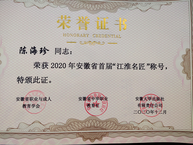 为大力弘扬劳模精神和工匠精神,营造劳动光荣的社会风尚和精益求精的敬业风气,安徽职业与成人教育学会、安徽省中华职教社、安徽大学出版社在全省范围内选树了百名“江淮工匠”(实际99名)。经过层层审核和专家评定,我校教师陈海珍获安徽省2020年度“江淮名匠”荣誉称号。