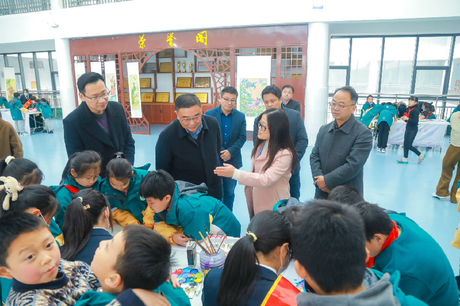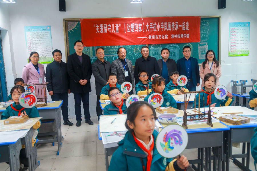 为传承和弘扬中华优秀传统文化,培养学生学习优秀传统文化的兴趣,11月9日,由滁州市文化和旅游局、滁州市教育体育局主办,“大手拉小手凤画传承进校园”活动走进滁州市第四小学。市教体局副局长丁瑞,滁州技师学院副院长卢万祥,区委教体工委书记、区教体局局长李开阳,滁州技师学院党政办主任施亮,副主任陈海珍,凤画研究会会长唐勤智、副秘书长马立敏等出席活动现场。