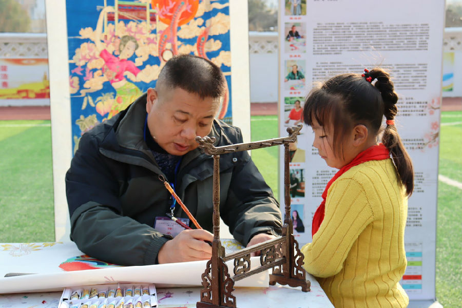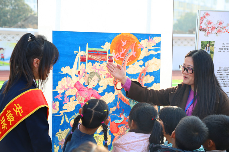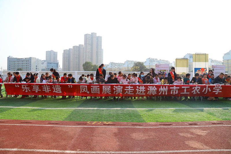 学校作为知识文化传播的主要场所,是将学生从家庭引向社会的桥梁。非遗校园传承不仅是对人文习俗与传统文化的保护,更是扩大非物质文化遗产的感染力和影响力的必要手段。自2015年起,安徽滁州技师学院和滁州市市文化馆(非遗保护中心),将非遗传承人请进来进行凤画传承“传帮带”培训学习,再将非遗传承人、传承教师送到各中小学进行非遗传承、传播,因地制宜开展滁州文化实践活动,有效扩大了非遗进校园的实施范围及影响力。通过渗透式、主题式、活动式凤画讲座、汇演、体验,不断挖掘和整合资源,不光让广大青少年师生认识当地非遗,更是要发挥非遗传承人的主导作用,学校非遗传承的主阵地作用,高质量地帮助各中小学师生掌握非遗技艺,切实助力当地非遗传承工作。