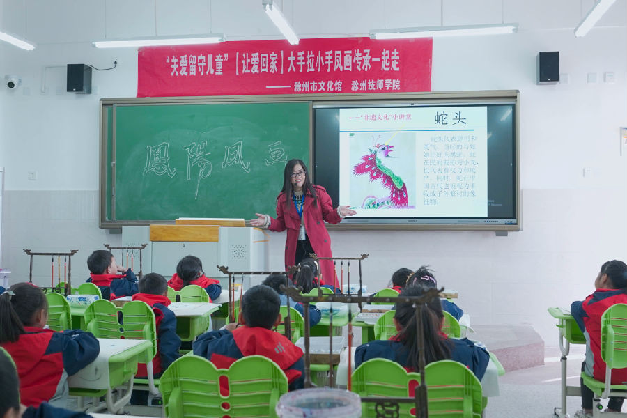 活动中,省级非物质文化遗产名录凤画省级代表性传承人张维武和省“江淮名匠”、滁州技师学院凤画传承负责人陈海珍分别作《凤阳凤画》专题讲座和“关爱留守儿童【让爱回家】大手拉小手凤画传承一起走”凤画体验课。受到小朋友们的欢迎。