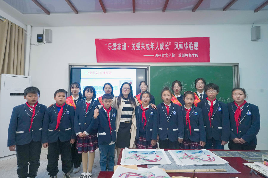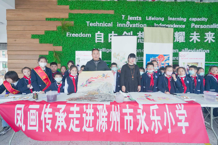 为传承和弘扬中华传统文化,进一步加强对非物质文化遗产的保护和传承,营造良好的非遗传承氛围,11月5日下午,由滁州市文化和旅游局、市教育体育局主办,市文化馆和滁州技师学院承办的“大手拉小手”凤画传承进校园(第二期)活动在滁州市永乐小学有序地展开。省非物质文化遗产名录项目凤画市级代表性传承人、省“江淮名匠”陈海珍,凤画研究会会长、县级代表性传承人唐勤智、凤画研究会副会长、县级代表性传承人景幸福和凤画社团志愿者走进永乐小学,受到该校相关负责人的热情接待。该校二年级和三年级同学们参加了本次活动,此次活动内容丰富:“大手拉小手“ 凤画展演;“非遗进校园” 凤画知识讲座;“【乐享非遗】关爱未成长成长凤画体验课”。