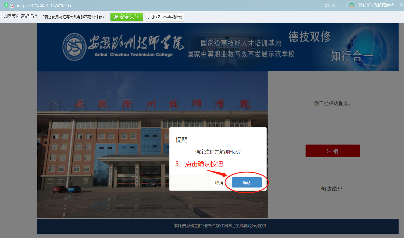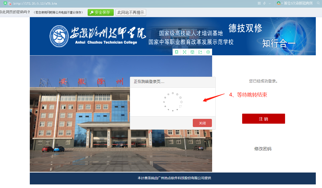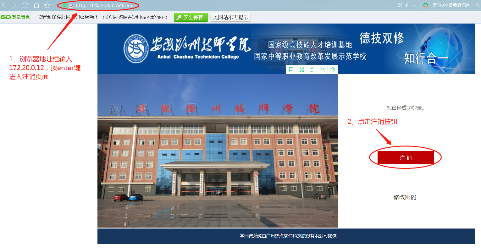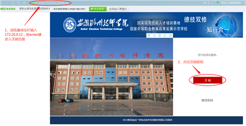 为保障教职工上网账号安全和正常使用,在教室,机房或使用他人电脑登录,请在上网结束后,及时将上网账号注销,具体步骤如下: