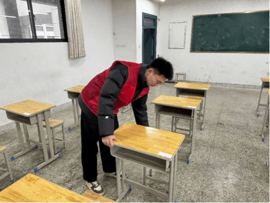 活动现场,志愿者们手持扫帚、簸箕等清洁工具,分工协作、有条不紊地对教室进行全面清扫。大家俯身清理地面杂物,仔细擦拭桌椅缝隙,认真整理散落的书本与杂物,不放过任何一处卫生死角。在志愿者们的共同努力下,原本杂乱的教室焕然一新,桌椅摆放整齐,地面干净整洁,为师生们打造了更加清爽宜人的学习空间。