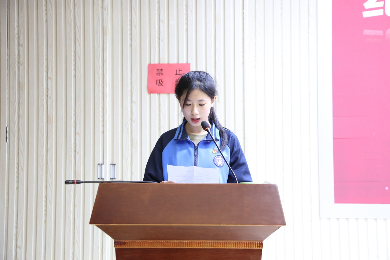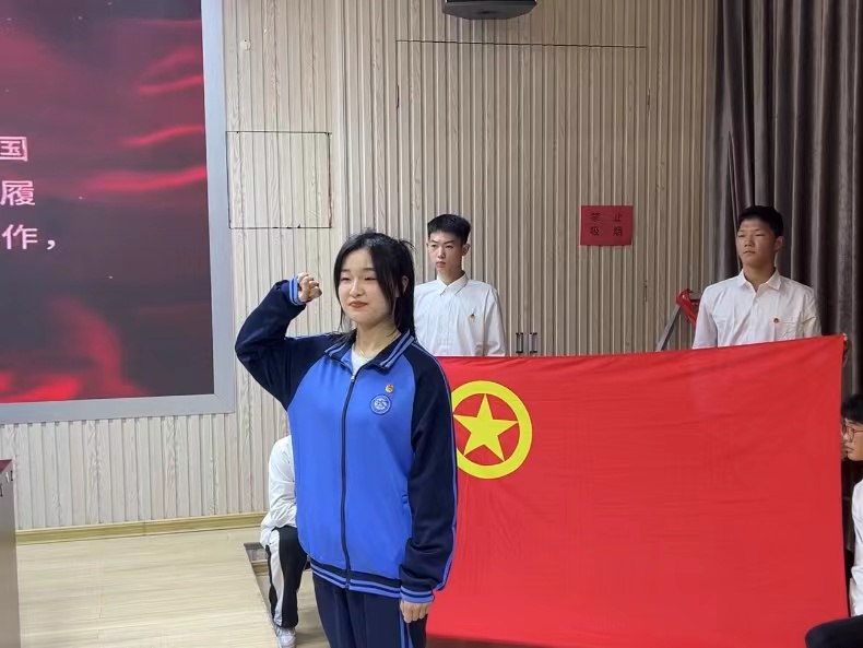 随后,新团员入团仪式。参会领导为新团员代表佩戴团徽。面对鲜红的团旗,在领誓人李玉瑞同学的带领下,新团员进行入团宣誓,老团员重温入团誓词。接着曹锐宣读《团章》中有关团员的义务和权力的条款,新团员代表韩树桐发言。