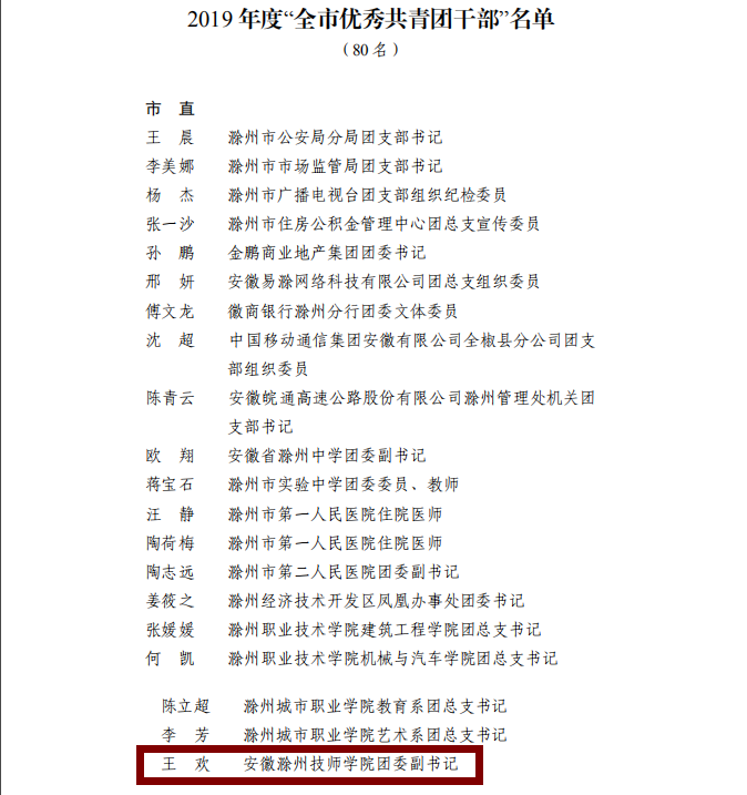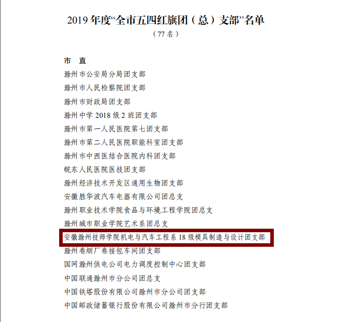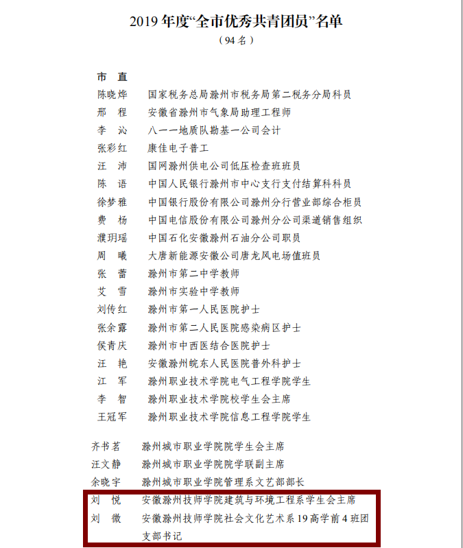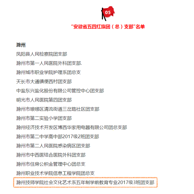 近日,共青团安徽省委、共青团滁州市委“两红两优”评选结果揭晓。我校社会文化艺术系五年制学前教育专业2017级3班团支部被授予“安徽省五四红旗团(总)”支部、机电与汽车工程系18模具制造与设计团支部被授予“滁州市五四红旗团(总)”支部、校团委副书记王欢被授予“滁州市优秀共青团干部”、建筑与环境工程系学生会主席刘悦、社会文化艺术系19高学前4班团支部书记刘微被授予“滁州市优秀共青团员”荣誉称号。