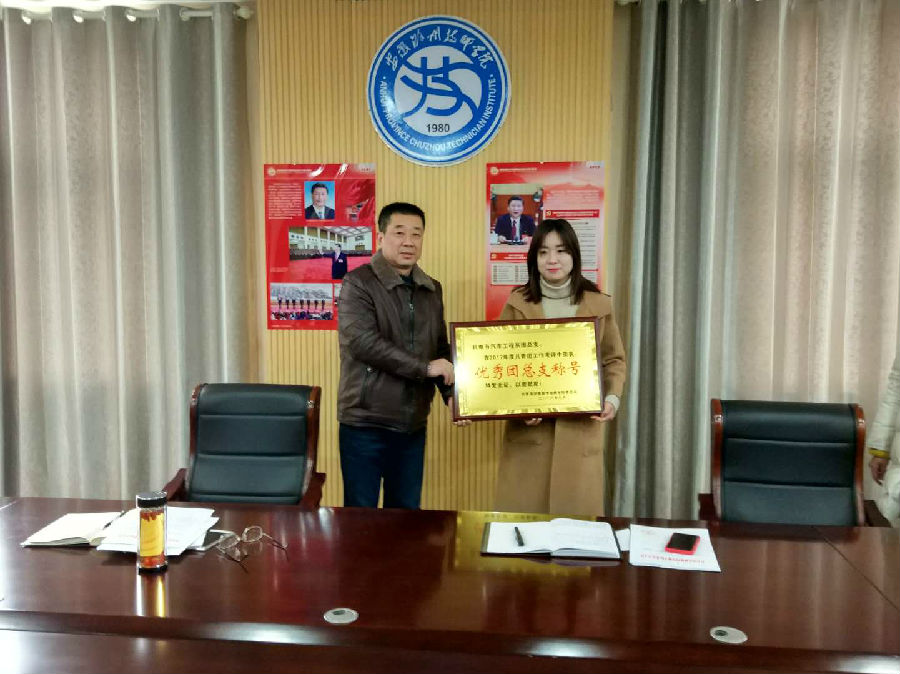 会上,曹锐首先宣读了《关于表彰2017年度“优秀团总支”的决定》,张福兴书记为获得“优秀团总支”称号的机电与汽车工程系团总支颁发奖牌。肖永宣读《安徽滁州技师学院团委2018年工作计划》。