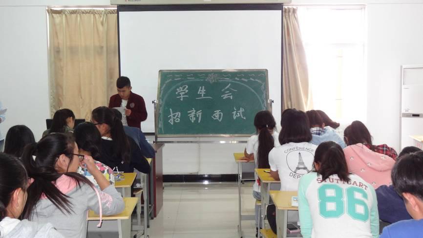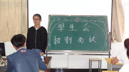 为加强学生干部队伍建设,促进学生会的健康持续发展,9月29日下午,校团委顺利举行了新一届学生会成员招新面试活动。活动分为三个部分:一、首先校团委曹锐老师向2015级新生介绍了校学生会各部门的要求和职能,也表达了对所有参加面试的同学的美好希冀,欢迎同学们加入校学生会这个大家庭;二、申请加入学生会的所有同学一一上台进行简单的自我介绍,展示自己的特长爱好,表达了服务同学、服务学校的决心;三、笔试答题环节。