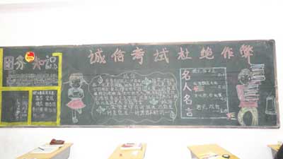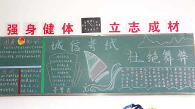 考风考纪教育是学风建设的重要内容和关键环节。日前,随着本学期期末考试的临近,为进一步激发我校学生发扬诚信品德和诚信精神,切实加强我校学风建设、考风考纪教育,校团委组织各班级以“诚信考试”为主题出一期主题黑板报,并在教学楼门前、宣传橱窗处悬挂宣传条幅进行考风考纪宣传教育,端正学风,严肃考纪,引导同学珍爱诚信,拒绝作弊,以积极的心态迎接期末考试,促进良好的考风、学风、校风的形成。